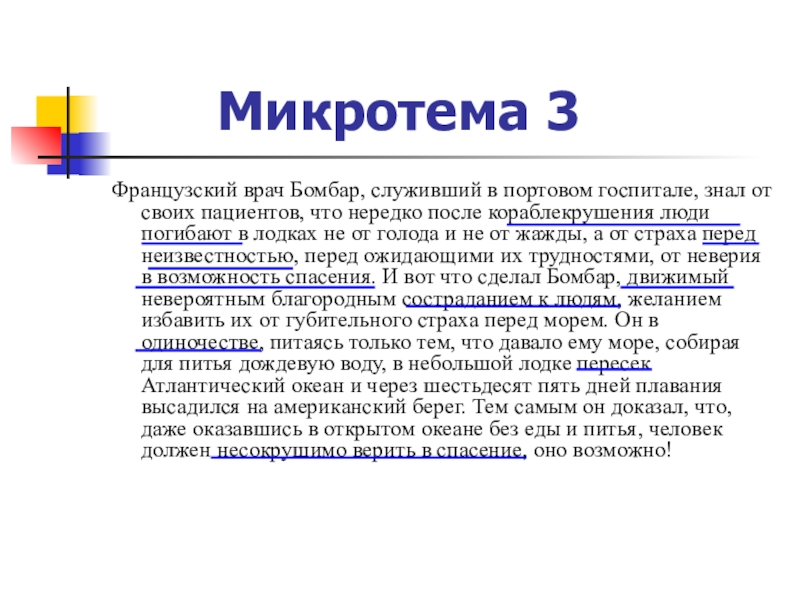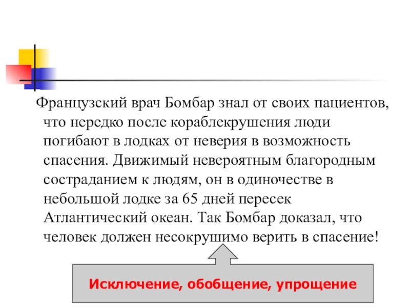 кораблекрушения люди погибают в лодках от неверия в возможность спасения. Движимый невероятным благородным состраданием к людям, он в одиночестве в небольшой лодке за 65 дней пересек Атлантический океан. Так Бомбар доказал, что человек должен несокрушимо верить в спасение!