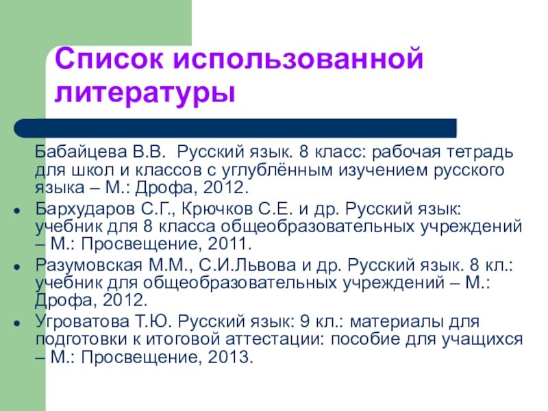 Угроватова Т.Ю. Русский язык: 9 кл.: материалы для подготовки к итоговой аттестации: пособие для учащихся – М.: Просвещение, 2013.
