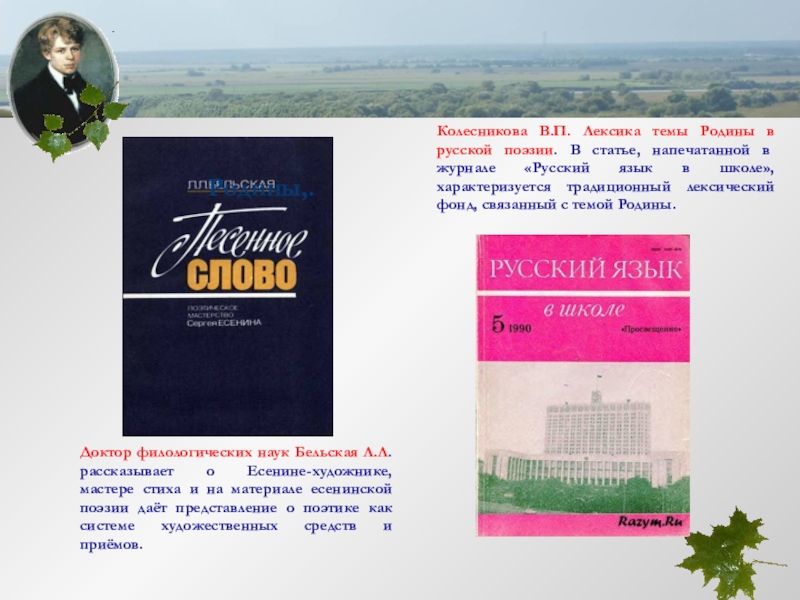 Колесникова В.П. Лексика темы Родины в русской поэзии. В статье, напечатанной в журнале «Русский язык в школе», характеризуется традиционный лексический фонд, связанный с темой Родины.