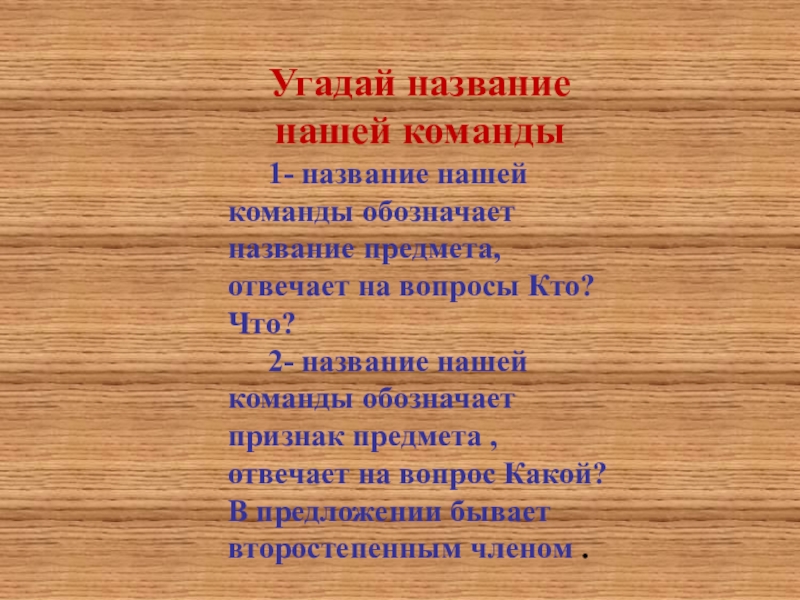 2- название нашей команды обозначает признак предмета ,отвечает на вопрос Какой? В предложении бывает второстепенным членом .