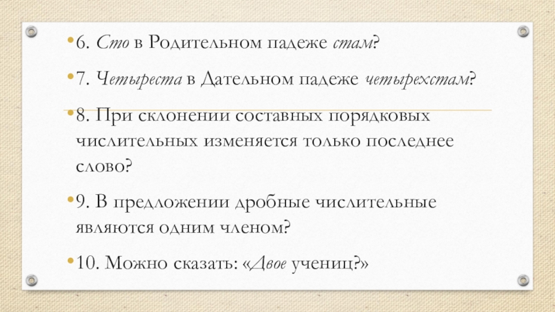 6. Сто в Родительном падеже стам?7. Четыреста в Дательном падеже четырехстам?8. При склонении составных порядковых числительных изменяется