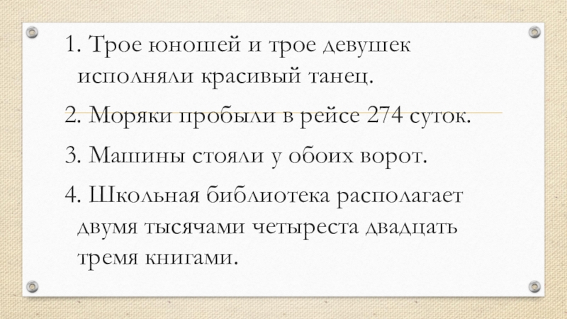 1. Трое юношей и трое девушек исполняли красивый танец.2. Моряки пробыли в рейсе 274 суток.3. Машины стояли
