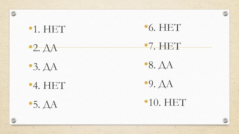 1. НЕТ2. ДА3. ДА4. НЕТ5. ДА6. НЕТ7. НЕТ8. ДА9. ДА10. НЕТ