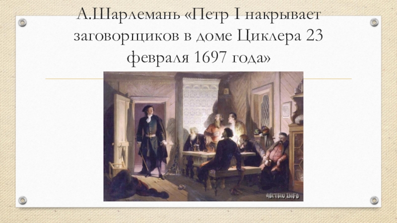 Слайд 14А.Шарлемань «Петр I накрывает заговорщиков в доме Циклера 23 февраля 1697