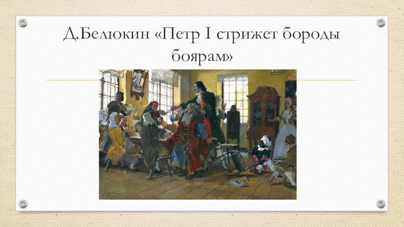 Слайд 18Д.Белюкин «Петр I стрижет бороды боярам»