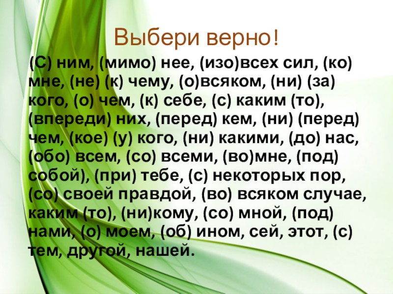(С) ним, (мимо) нее, (изо)всех сил, (ко)мне, (не)