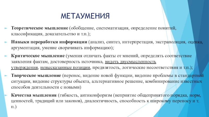синтез, интерпретация, экстраполяция, оценка, аргументация, умение сворачивать информацию);