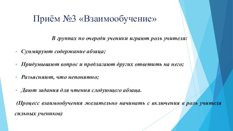 (Процесс взаимообучения желательно начинать с включения в роль учителя сильных учеников)