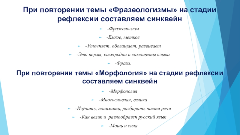 Слайд 19При повторении темы «Фразеологизмы» на стадии рефлексии составляем синквейн