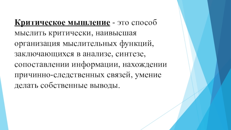Слайд 4Критическое мышление - это способ мыслить критически, наивысшая организация мыслительных функций,