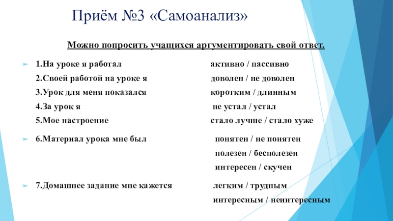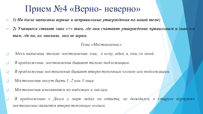 2) Учащиеся ставят знак «+» там, где они считают утверждение правильным и знак «-» там, где по, их мнению, оно не верно.