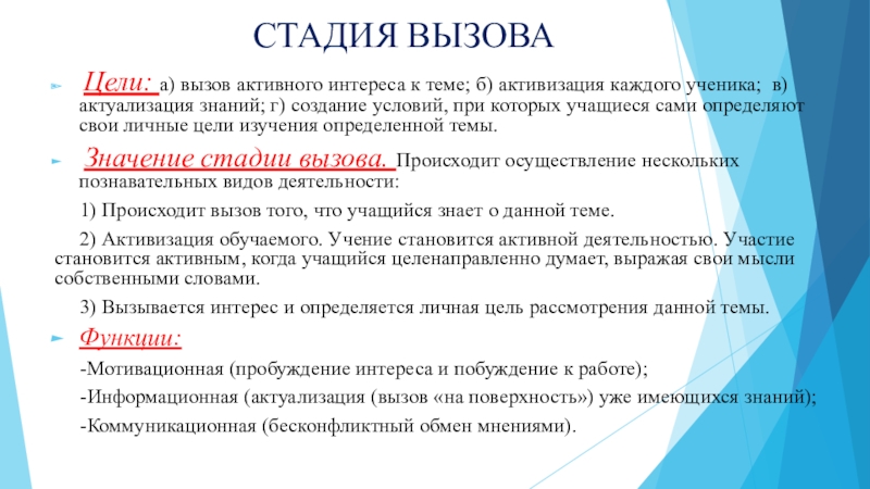 Значение стадии вызова. Происходит осуществление нескольких познавательных видов деятельности: