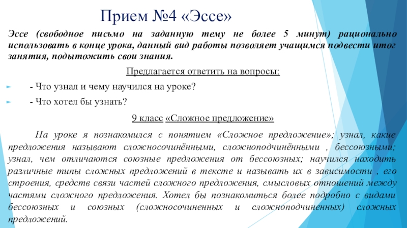 минут) рационально использовать в конце урока, данный вид работы позволяет учащимся подвести итог занятия, подытожить свои знания.
