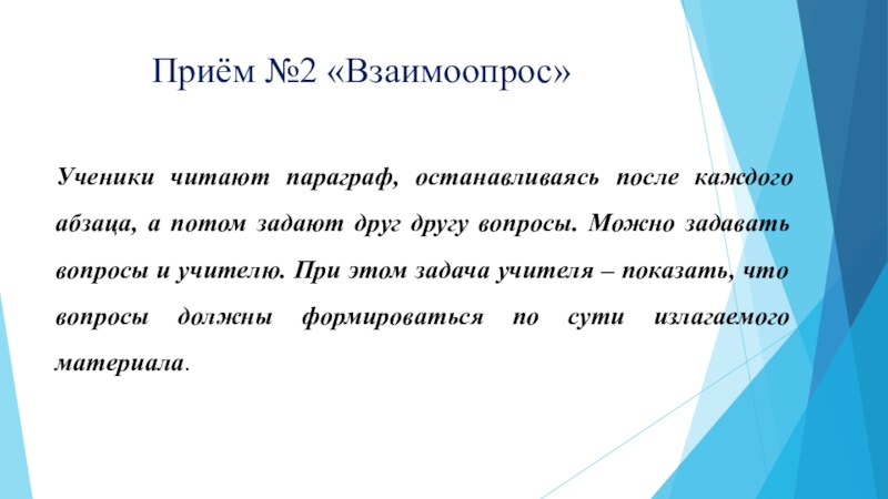 задают друг другу вопросы. Можно задавать вопросы и учителю. При этом задача учителя – показать, что вопросы должны формироваться по сути излагаемого материала.