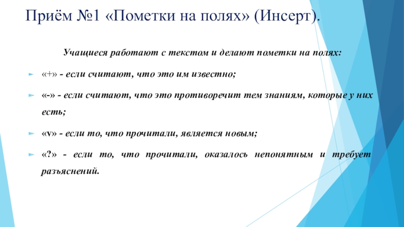 Слайд 14Приём №1 «Пометки на полях» (Инсерт).