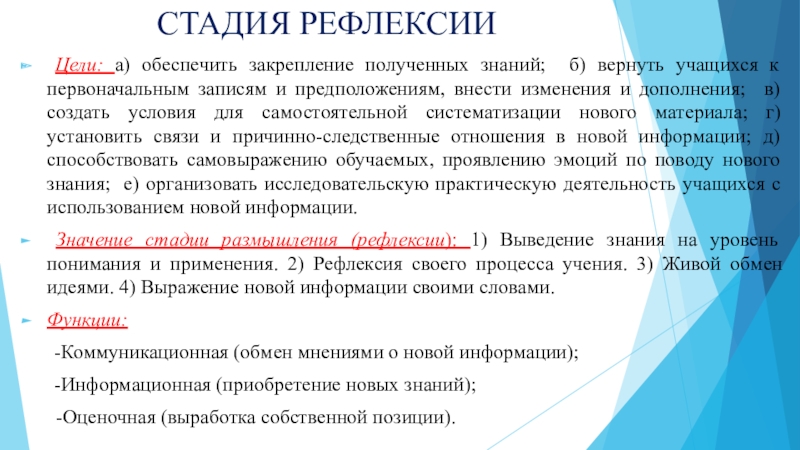 Значение стадии размышления (рефлексии): 1) Выведение знания на уровень понимания и применения. 2) Рефлексия своего процесса учения. 3) Живой обмен идеями. 4) Выражение новой информации своими словами.