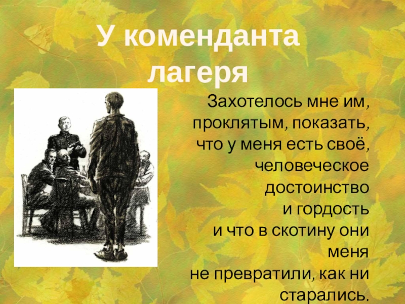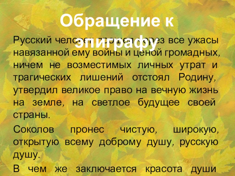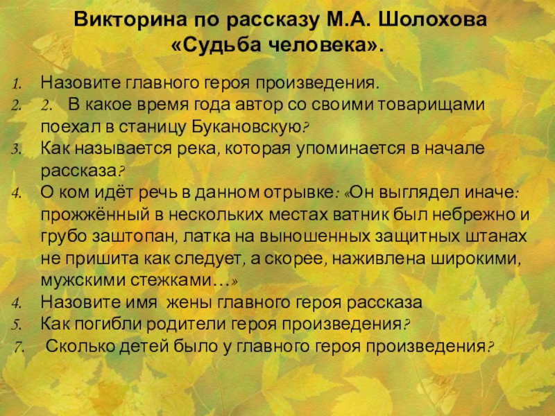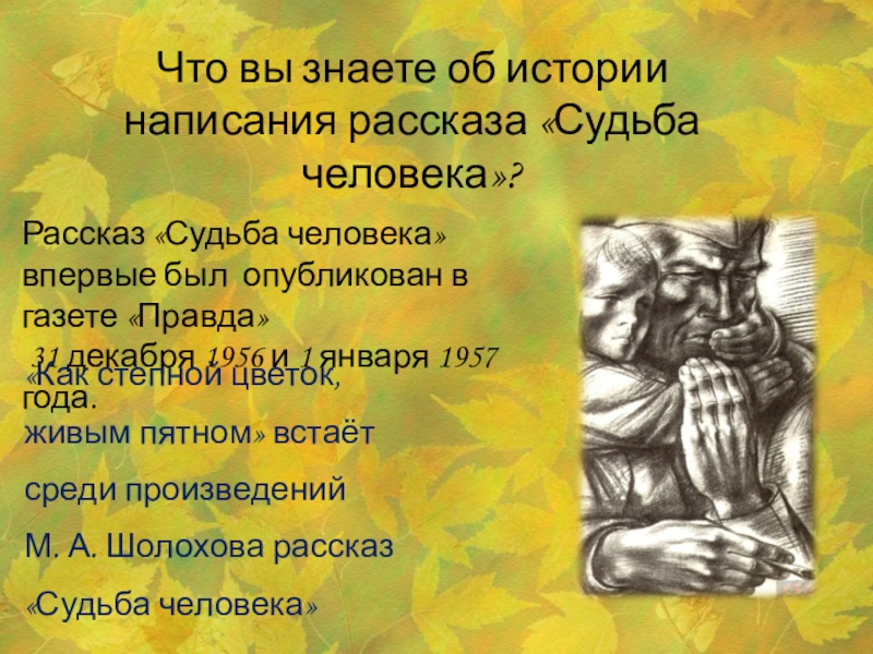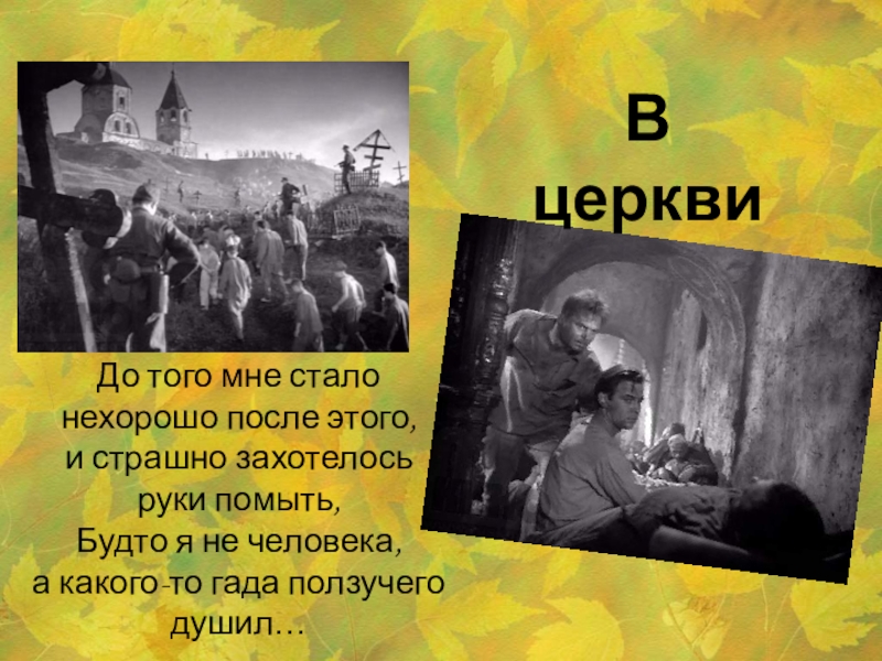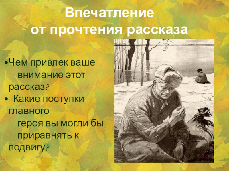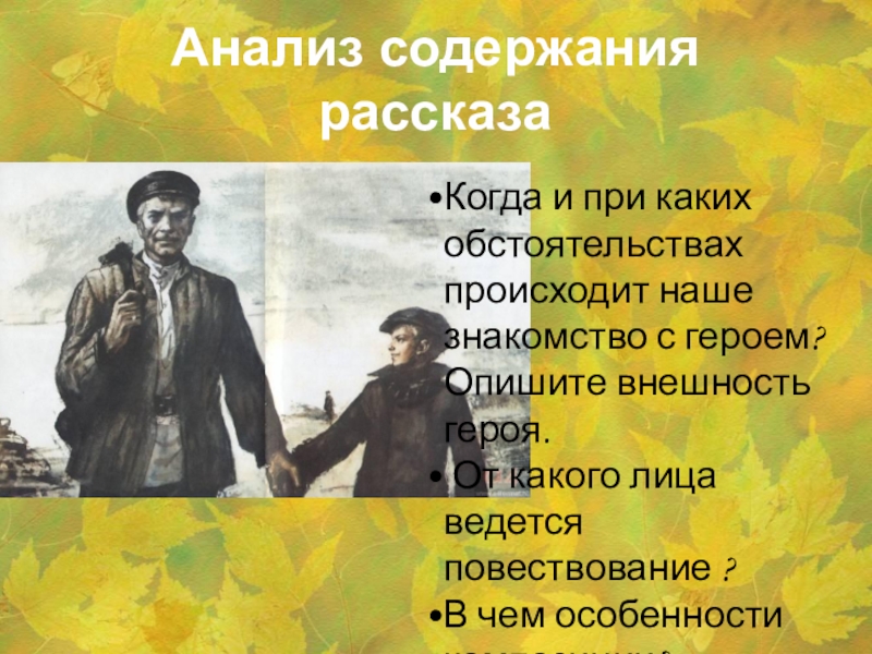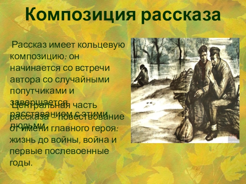 Центральная часть рассказа – повествование от имени главного героя: жизнь до войны, война и первые послевоенные годы.
