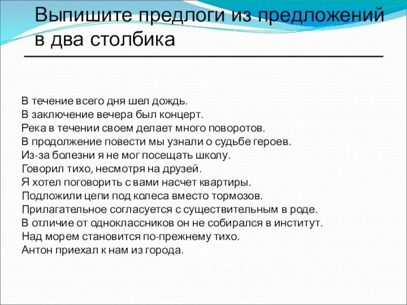 Слайд 5Выпишите предлоги из предложений в два столбика
