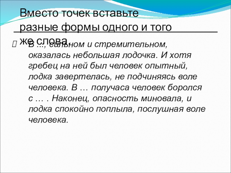 Вместо точек вставьте разные формы одного и того же слова. В ..., сильном и стремительном, оказалась небольшая ло­дочка. И хотя гребец на ней был человек опытный, лодка завертелась, не подчиняясь воле человека. В … получаса чело­век