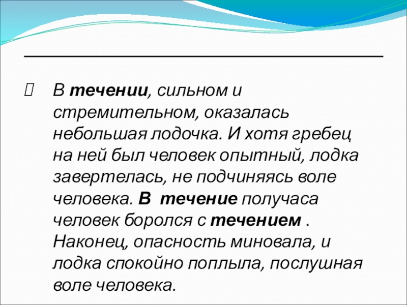 на ней был человек опытный, лодка завертелась, не подчиняясь воле человека. В течение получаса человек боролся с течением . Наконец, опасность миновала, и лодка спо­койно поплыла, послушная воле человека.
