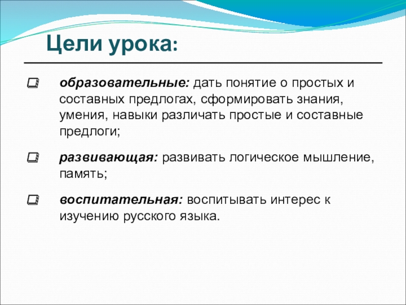 образовательные: дать понятие о простых и составных предлогах, сформировать знания,
