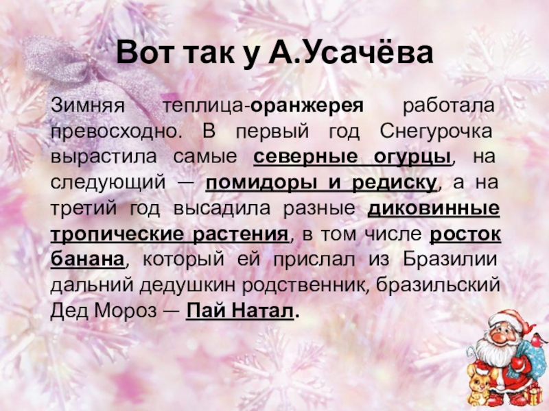 вырастила самые северные огурцы, на следующий — помидоры и редиску, а на третий год высадила разные диковинные тропические растения, в том числе росток банана, который ей прислал из Бразилии дальний дедушкин родственник, бразильский Дед Мороз — Пай Натал.