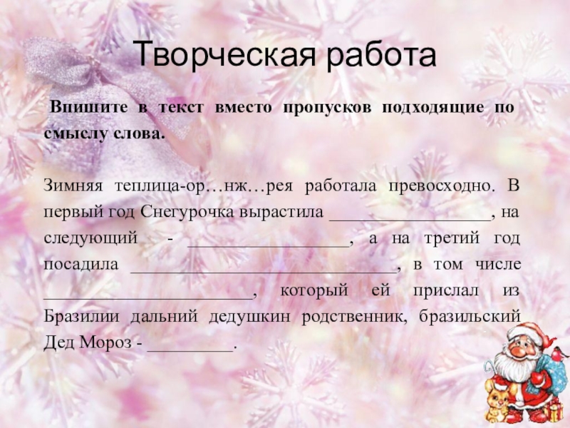 теплица-ор…нж…рея работала превосходно. В первый год Снегурочка вырастила _________________, на следующий - _________________, а на третий год посадила ____________________________, в том числе ______________________, который ей прислал из Бразилии дальний дедушкин родственник, бразильский Дед Мороз - _________.