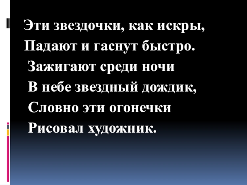Эти звездочки, как искры, Падают и гаснут быстро.  Зажигают среди ночи  В небе звездный