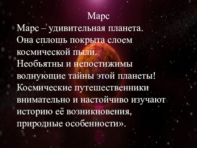 МарсМарс – удивительная планета. Она сплошь покрыта слоем космической пыли.Необъятны и непостижимы волнующие тайны этой планеты!Космические путешественники