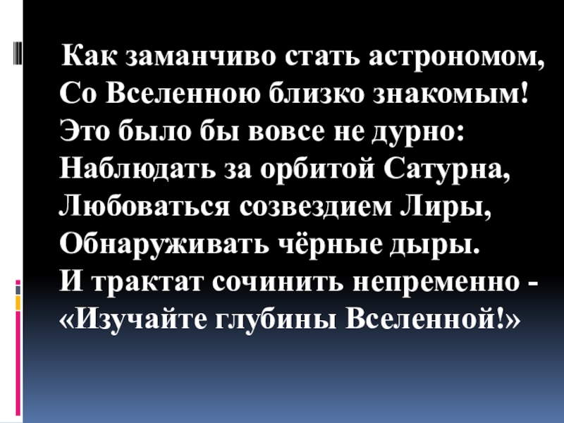 бы вовсе не дурно: Наблюдать за орбитой Сатурна, Любоваться созвездием Лиры, Обнаруживать чёрные дыры. И трактат сочинить непременно - «Изучайте глубины Вселенной!»