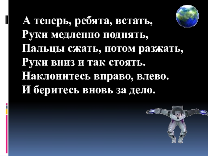 Слайд 8 А теперь, ребята, встать, Руки медленно поднять, Пальцы сжать, потом разжать, Руки