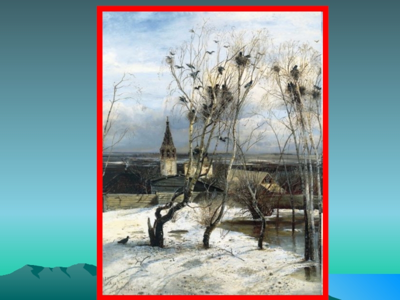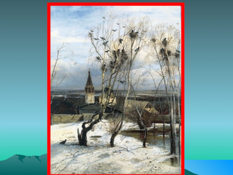 А.К.Саврасов — один из основоположников русской пейзажной живописи. Своей картиной «Грачи прилетели» художник передает состояние природы, которое она испытывает ранней весной. Чуть пригрело солнышко, и… в воздухе запахло весной. Поля, виднеющиеся вдали, уже освободились от снега. Талая вода пропитала потемневшие сугробы, …и наполнила пруд. Высокое весеннее небо еще не стало чистым, но… голубизна уже проглядывает сквозь облака.
