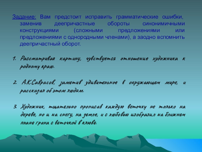 Слайд 21Задание: Вам предстоит исправить грамматические ошибки, заменив деепричастные обороты синонимичными конструкциями