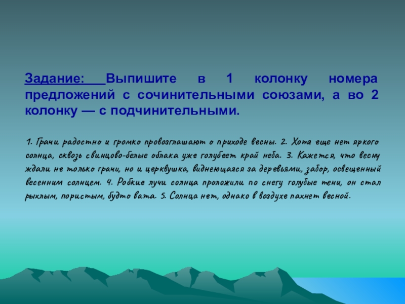Слайд 18Задание: Выпишите в 1 колонку номера предложений с сочинительными союзами, а