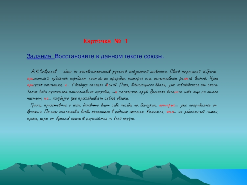 Задание: Восстановите в данном тексте союзы.