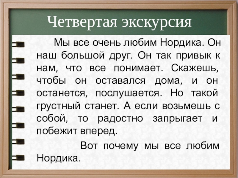 только на лбу белая звездочка да на передних лапках белые носочки. На правой подлиннее, на левой покороче. Хвост у него колечком, а уши стоят, и оттого у Нордика вид веселый, жизнерадостный. Красивая у нас собака.