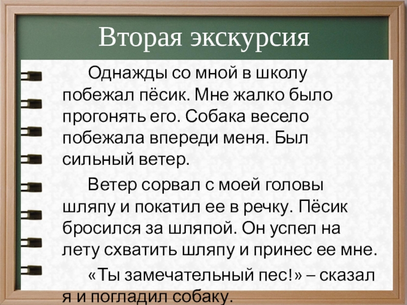 Ветер сорвал с моей головы шляпу и покатил ее в речку. Пёсик бросился за шляпой. Он успел на лету схватить шляпу и принес ее мне.