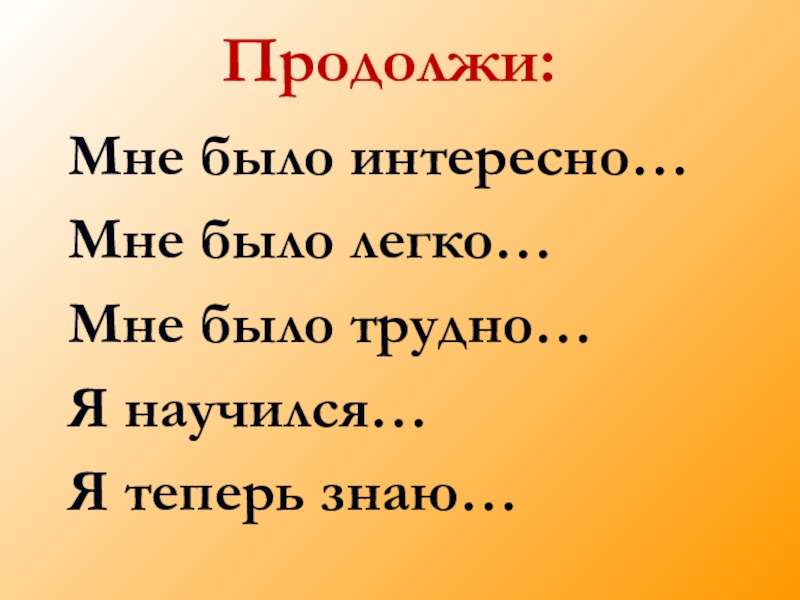 Мне было интересно…Мне было легко…Мне было трудно…Я научился…Я теперь знаю…Продолжи: