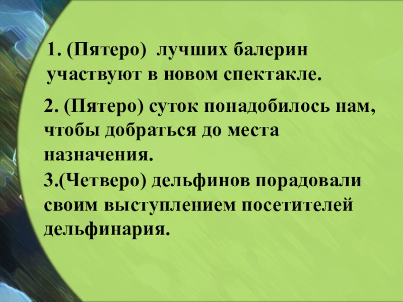 3.(Четверо) дельфинов порадовали своим выступлением посетителей дельфинария.