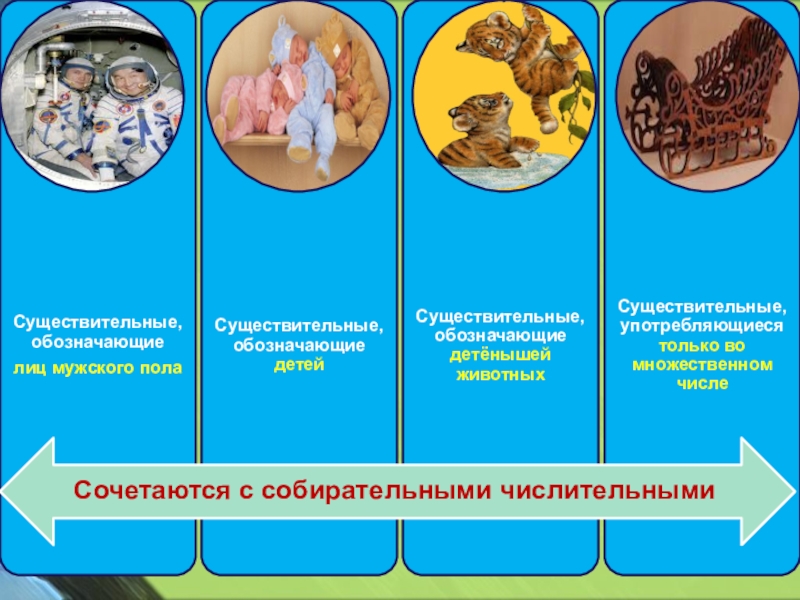 Сочетаются с существительными, обозначающими лица мужского пола, детей и детёнышей животных, предметы, употребляющиеся только во мн.ч.