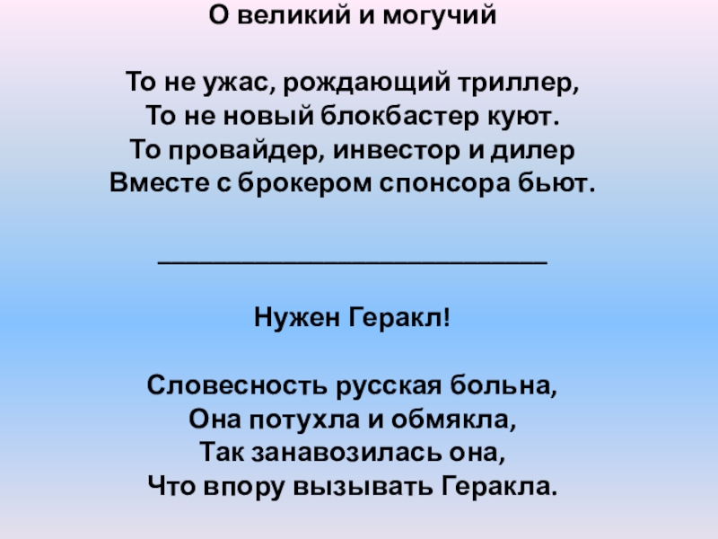 Ироническая поэзия, высмеивающая чрезмерное использование сленга и иноязычных слов. Проблема речевых ошибок.