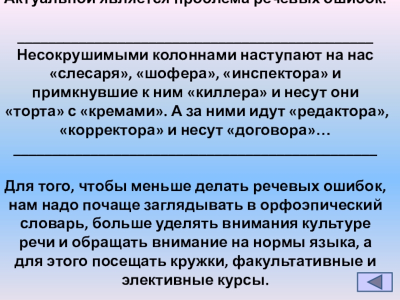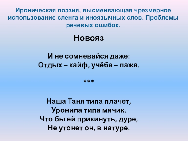Ироническая поэзия, высмеивающая чрезмерное использование сленга и иноязычных слов. Проблемы речевых ошибок.