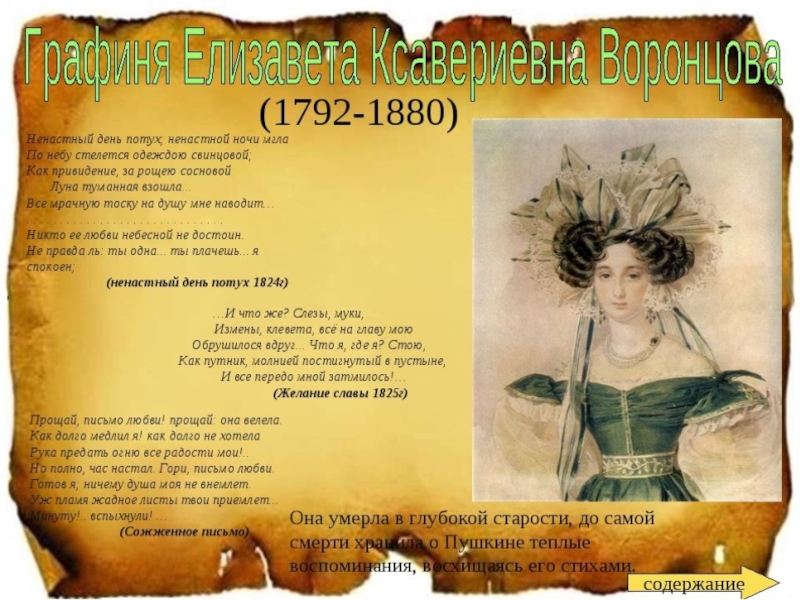 Подруга дней моих суровых, Голубка дряхлая моя! Одна в глуши лесов сосновых Давно,