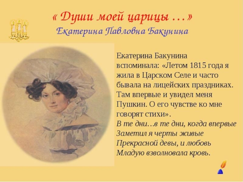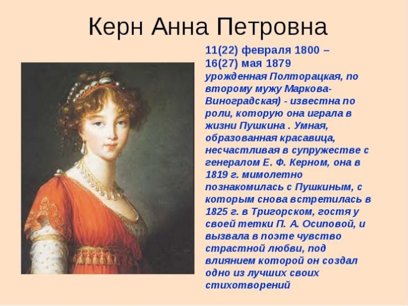 Мы чтить тебя привыкли с детскихлет, И дорог нам твой образ благородный; Ты рано смолк,но в памяти народнойТы не умрешь,возлюбленный поэт!Бессмертен тот,чья муза до концаДобру и красоте не изменяла, Кто волновать умел людей сердца