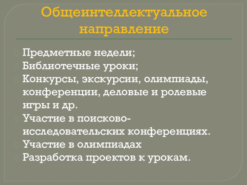 Общеинтеллектуальное направлениеПредметные недели;Библиотечные уроки;Конкурсы, экскурсии, олимпиады, конференции, деловые и ролевые игры и др.Участие в поисково-исследовательских конференциях. Участие