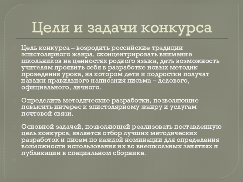 Цели и задачи конкурсаЦель конкурса – возродить российские традиции эпистолярного жанра, сконцентрировать внимание школьников на ценностях родного