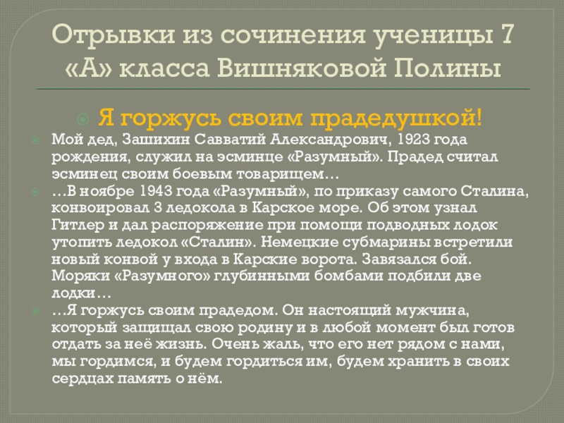 Отрывки из сочинения ученицы 7 «А» класса Вишняковой ПолиныЯ горжусь своим прадедушкой!Мой дед, Зашихин Савватий Александрович, 1923