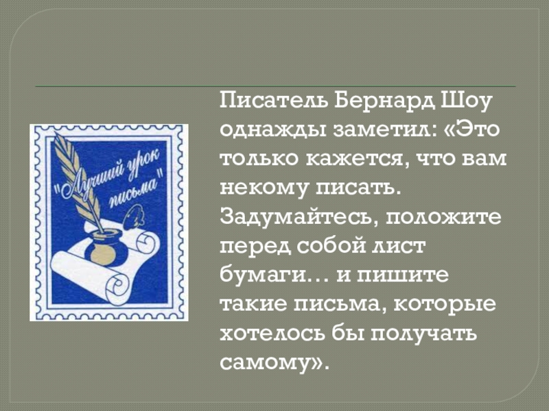 Писатель Бернард Шоу однажды заметил: «Это только кажется, что вам некому писать. Задумайтесь, положите перед собой лист