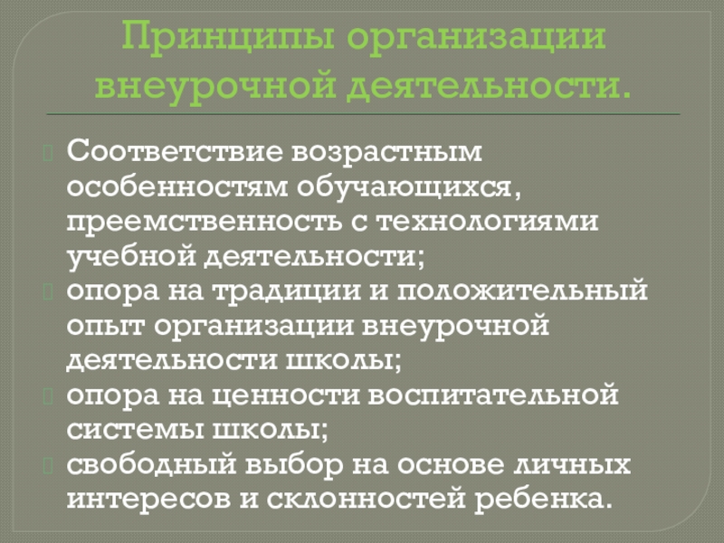 Принципы организации внеурочной деятельности.Соответствие возрастным особенностям обучающихся, преемственность с технологиями учебной деятельности;опора на традиции и положительный опыт