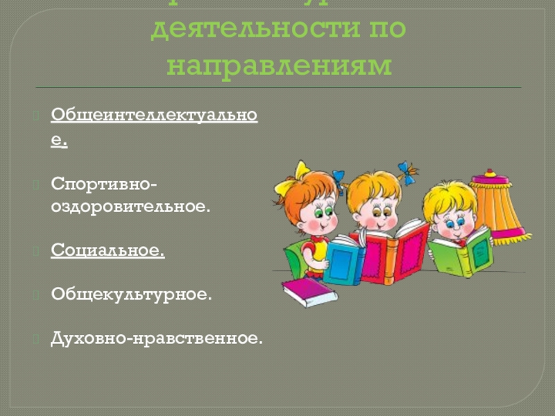 Формы внеурочной деятельности по направлениямОбщеинтеллектуальное.Спортивно-оздоровительное.Социальное.Общекультурное.Духовно-нравственное.